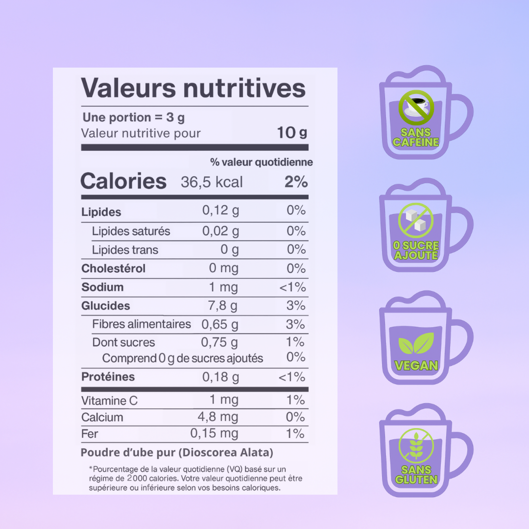 Contrairement au café ou au matcha, l’ube ne contient pas de caféine. Il ne provoque donc ni anxiété, ni dépendance.